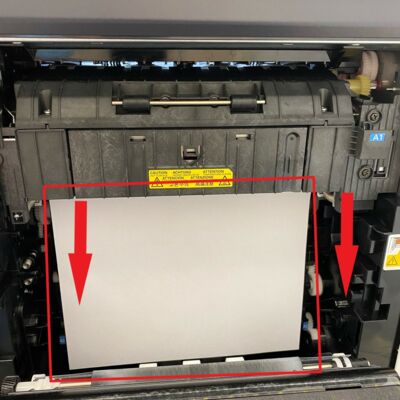 Das Stück Papier kann mit Zug an beiden Seiten des Papiers, im Regelfall, entfernt werden. Sollte das Blatt eingerissen sein, bitte die IT informieren.